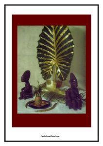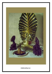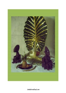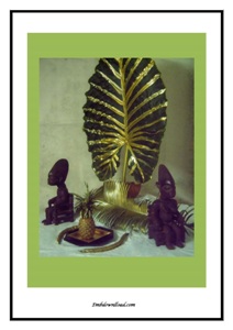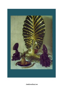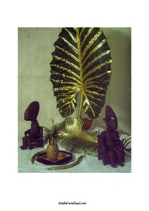 TABLEAU NUMERIQUE AVEC FEUILLE DE MACABO, STATUETTES ET ELEMENTS TROPICAUX