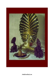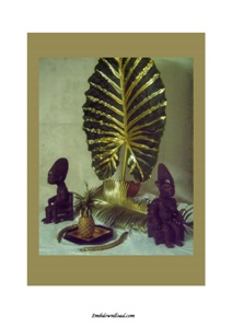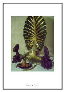 DIGITAL PICTURE WITH MACABO LEAF, STATUETTES AND TROPICAL ELEMENTS