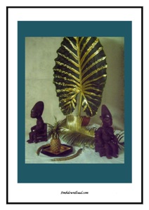 TABLEAU NUMERIQUE AVEC FEUILLE DE MACABO, STATUETTES ET ELEMENTS TROPICAUX